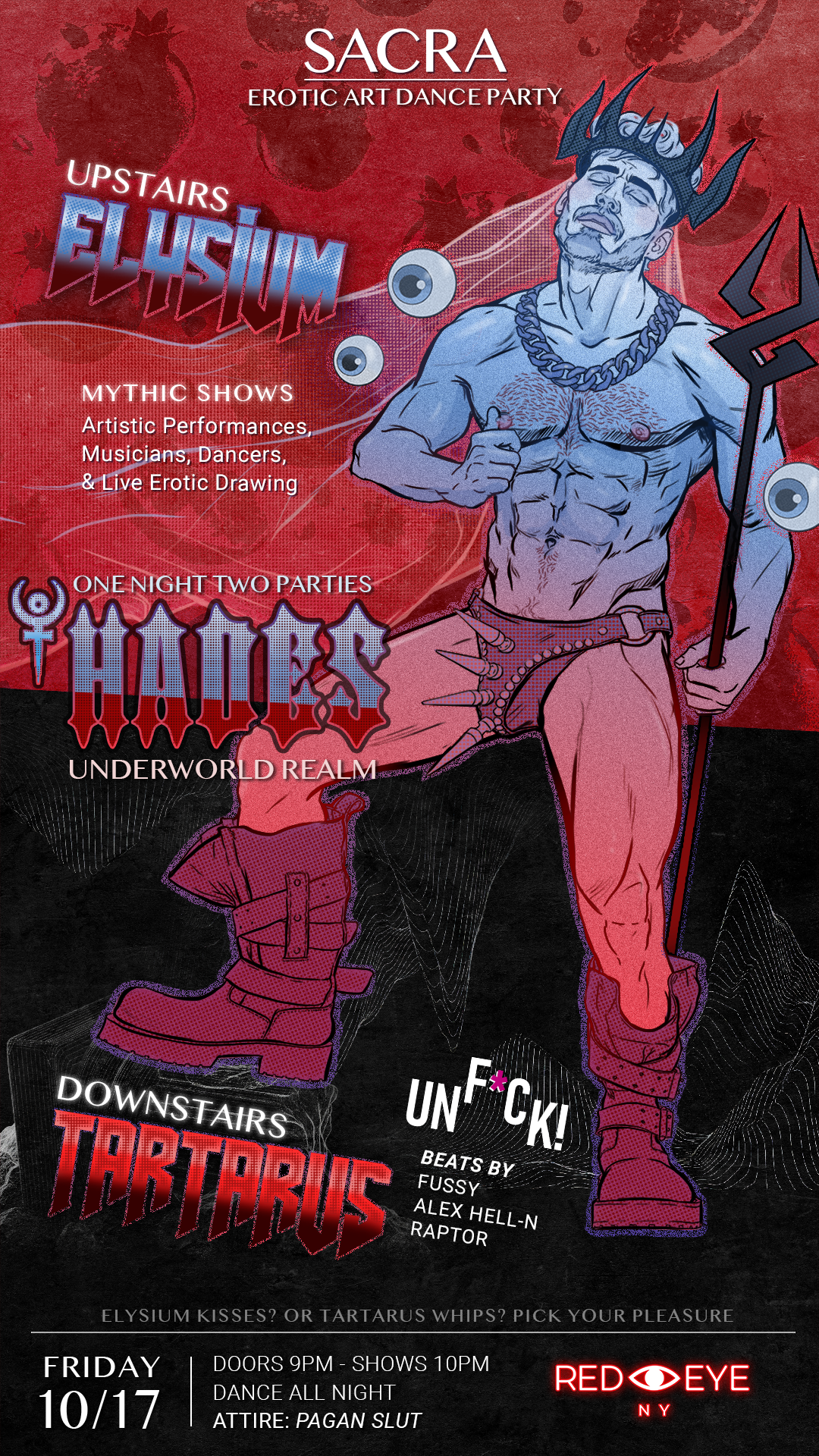 For one night only, SACRA and UNF*CK split the gates of the afterlife wide open. Enter HADES: Underworld Realm — a collision of myth, art, and sweat where two worlds pulse under one roof. Upstairs: ELYSIUM — a luminous temple of performance and live erotic drawing. Eyes linger, bodies transform, and fleeting moments are captured as living myth. Downstairs: TARTARUS — UNF*CK drags you into the abyss with pounding sets from Fussy, Alex Hell-N, and Raptor. A dark vortex of bass, heat, and ecstatic release. Chains rattle, eyes watch, gods descend. This isn’t just a party — it’s a ritual. Paradise above, chaos below, and only one question remains: Which realm will claim you?